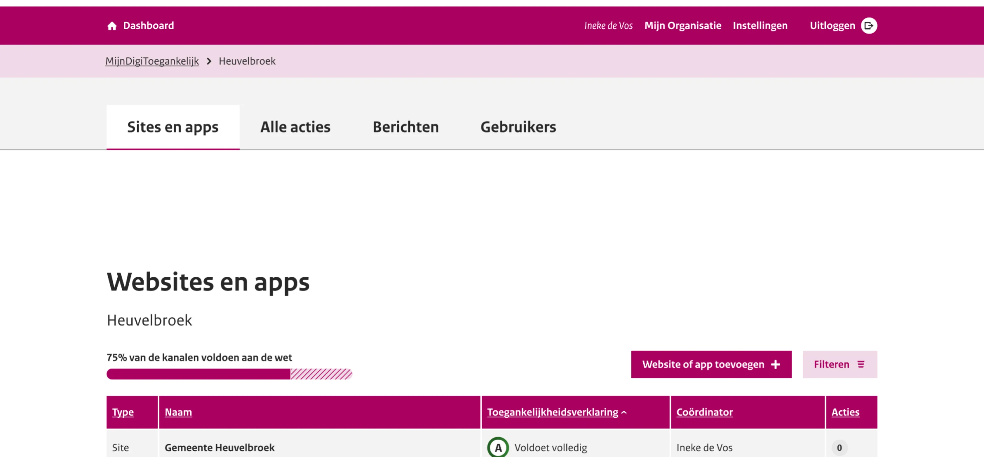In één centrale omgeving zie je alle websites en mobiele apps waar je organisatie verantwoordelijk voor is — inclusief hun toegankelijkheidsstatus. Dit overzicht helpt teams om snel te ontdekken waar nog stappen nodig zijn om wettelijk te voldoen en waar al vooruitgang is geboekt.