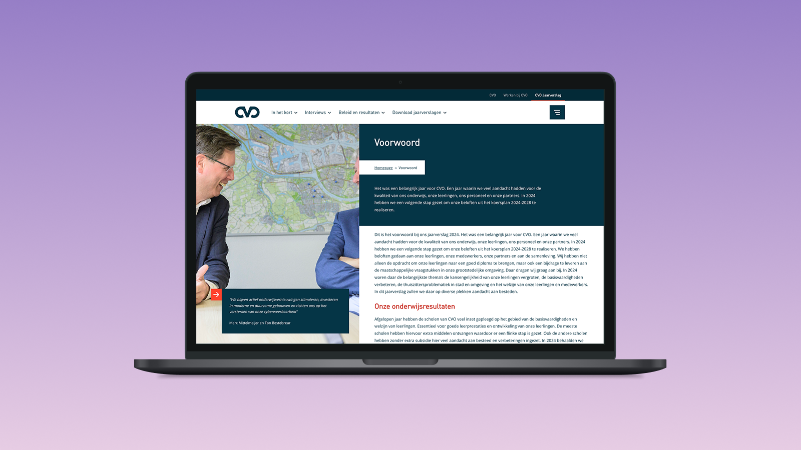 Het CMS is zo ingericht dat elk volgend jaarverslag moeiteloos opnieuw kan worden opgebouwd. CVO beheert zelf de content; ons team bewaakt de structuur, toegankelijkheid en techniek.