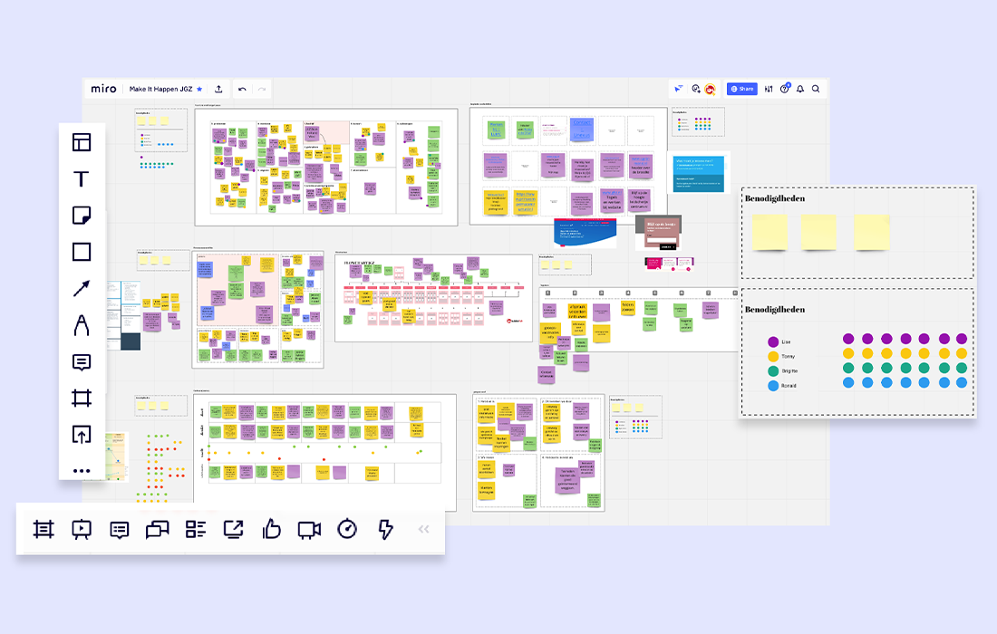 Tijdens deze digitale sessie maken wij gebruik van het programma Miro, hierin hebben wij de vrijheid om verschillende canvassen en methodieken klaar te zetten voor een digitale sessie. Aan het einde van een UX discovery sessie hebben wij genoeg informatie om Persona’s, huidige en de gewenste Customer Journey, toptaken, en Insight Cards te ontwikkelen. De verkregen inzichten dragen bij tijdens de totstandkoming van het UI en UX ontwerp en de functionaliteiten.