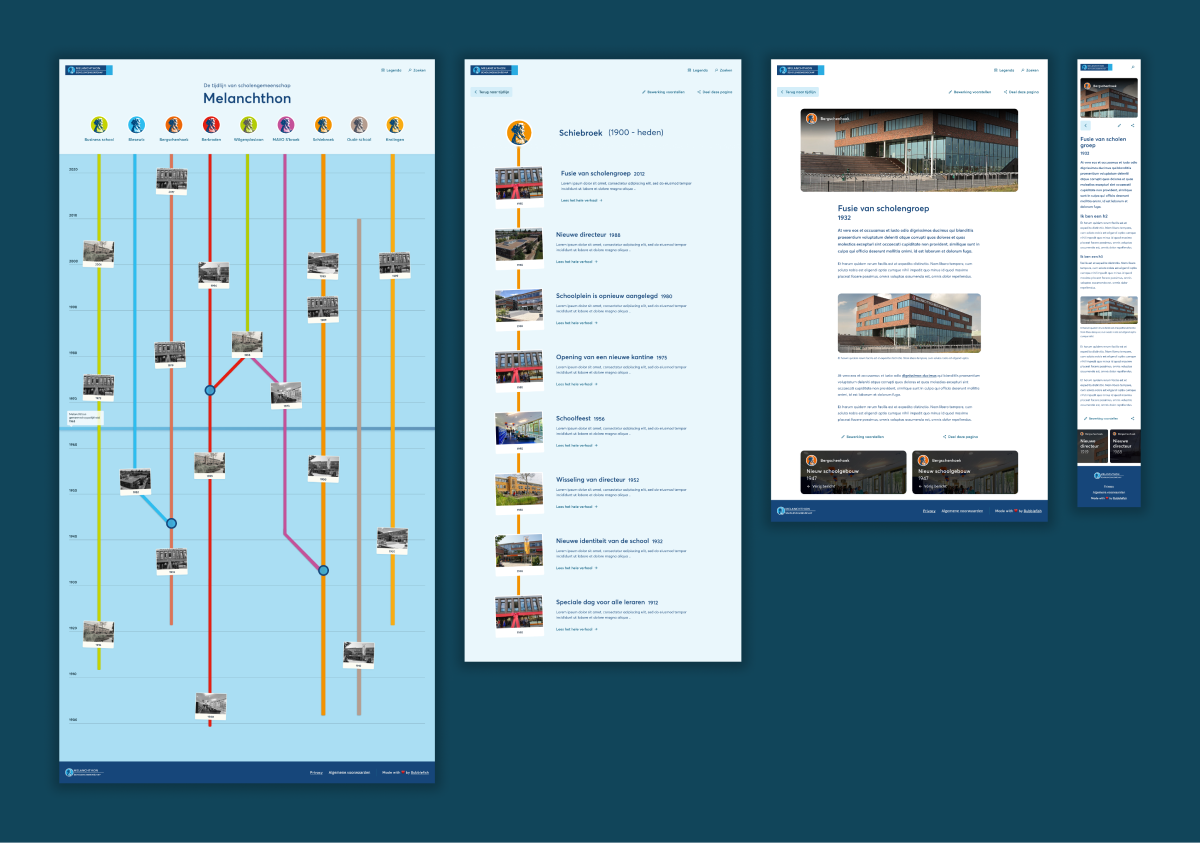 De doelstelling van deze interactieve tijdlijn is om zowel (oud)medewerkers als ouders en scholieren een inzicht te geven in de rijke geschiedenis van de scholengroep Melanchthon. De wens was om de website en de functionaliteit zo gebruiksvriendelijk mogelijk en visueel aantrekkelijk te maken, wat wij als UX experts graag oppakken. Daarnaast was er ook behoefte om de website eenvoudig beheerbaar te maken. Denk hierbij aan het kunnen klikken op foto’s en momenten in de tijdlijn, eenvoudig kunnen navigeren tussen berichten en het invoeren via het CMS van bewerkingen voor andere webredacteuren.